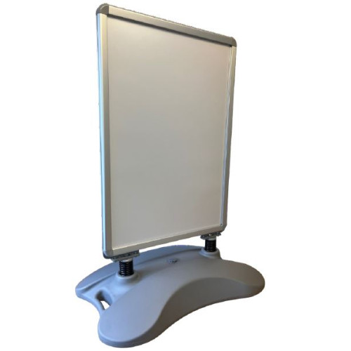 This water base pavement sign has a hollow base which can be filled with water or sand to provide strength and stability for your outdoor signage. The frame is attached using heavy duty springs, which prevent the weighted outdoor sign from falling over in strong winds. Double side and visible from both sides. Easy poster change, snap frame allows quick poster changes. Plastic covers protects against rain and UV light.