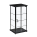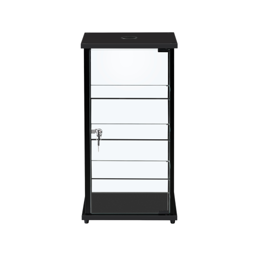 Glass sides, door and 3 shelves. Mirrored base and solid top with one single LED light.